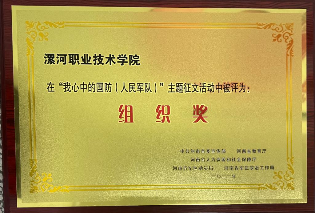 近日,中共河南省委宣传部、河南省教育厅、河南省人力资源和社会保障厅、河南省军区动员局、河南省军区政治工作局联合举办的“我心中的国防(人民军队)”征文活动获奖结果揭晓,OK138太阳集团在此次活动中荣获“组织奖”!