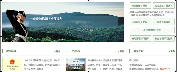 编者语:有些小伙伴看到这么多的菜单就有些懵了,其实不用紧张,如果你是第一次来的男生,直接从“兵役登记(男兵)”进入页面就可以了;否则就从“应征报名(男兵)”进入页面;如果想报名招收士官,就从“招收士官报名”进入页面,不过,今年的招收士官貌似还没开始 -_-!!