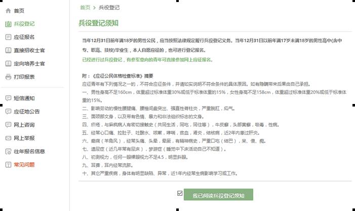开始报名你会发现跟所有的软件安装一样,会让你阅读一大篇的使用说明。小编十分不建议你跟安装软件一样,直接点确定。在这个时候请详细阅读 详细阅读 详细阅读(重说三)兵役登记须知。了解自己的各方面情况是否达标,这能避免后续工作出现的很多麻烦哦!