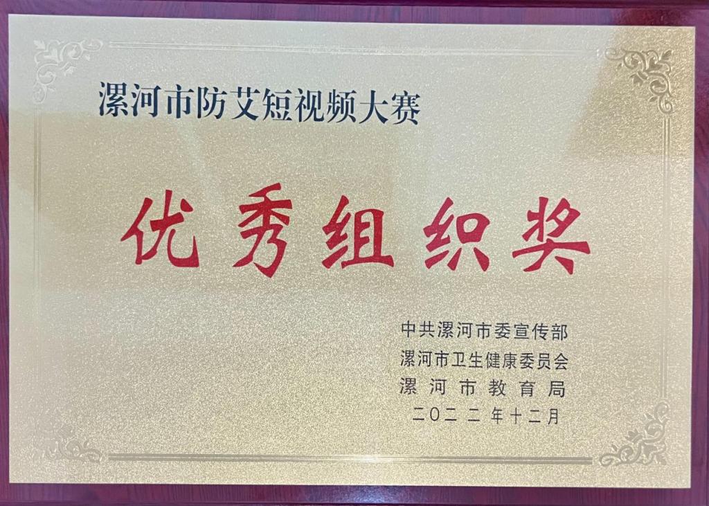 近日,在漯河市艾滋病防治工作委员会办公室统一安排下,中共漯河市委宣传部、漯河市卫生健康委员会和漯河市教育局共同组织开展了全市防艾短视频大赛活动,我校喜获“优秀组织奖”,吕佳豪、闫沪宇、于博宇同学的《防护“艾”》获二等奖,胡峥澳、刘明奇、苗帅杰同学的《艾滋知识街坊》,倪思彤、徐浩然、温嘉凡同学的《防艾抗艾》、高哲涵、郭梦妮、顾惠同学的《遏制艾滋,杜绝歧视》分获优秀奖。