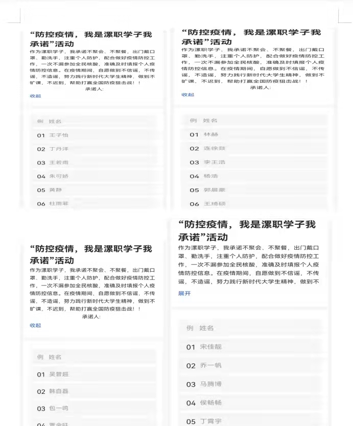 各院系通过通过网上承诺、接龙签名等多样形式,开展“防控疫情,我是漯职学子我承诺”等活动,倡导学生严格遵守漯河市和源汇区关于疫情防控的各项规定,服从学校疫情防控大局,不翻越学校围栏,引导学生正确认识疫情,科学了解疫情。提醒学生重视核酸检测工作,不得迟到、早退,按时按要求集合参与。规范佩戴口罩,勤洗手、勤消毒,保持个人卫生,宿舍要做到勤通风,不去人员密集场所。