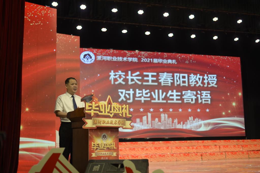 王春阳代表学校向全体毕业生致以最热烈的祝贺,向辛勤培育同学们的父母和老师致以衷心的感谢!王春阳表示,2021年是中国共产党成立一百周年,在这样一个特殊时刻,同学们的毕业显得更加意义非凡。王春阳向毕业生们提出了三点期望:一是终身学习。永远珍爱时间和生命,珍爱工作和生活,珍爱亲人和朋友,热爱祖国和人民,保持一颗求知之心,不断拼搏进取。二是敢于担当。践行“执着专注、精益求精、一丝不苟、追求卓越”的工匠精神,让勇于担当成为生命最靓丽的底色。三是勇于拼搏。凭借内心的勇气和坚韧,踏平挫折、克服困难,始终自信地去开拓进取、创造未来,用满腔豪情去实现宏图壮志,书写出更加壮丽的人生篇章。