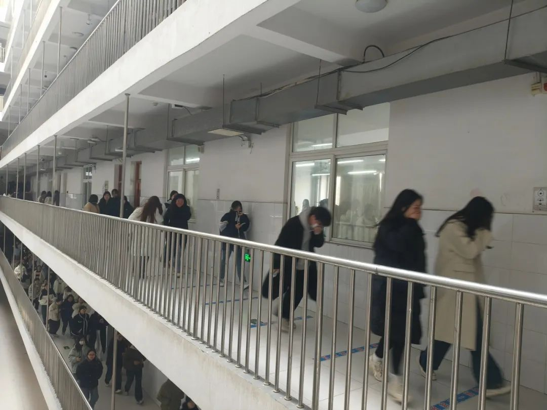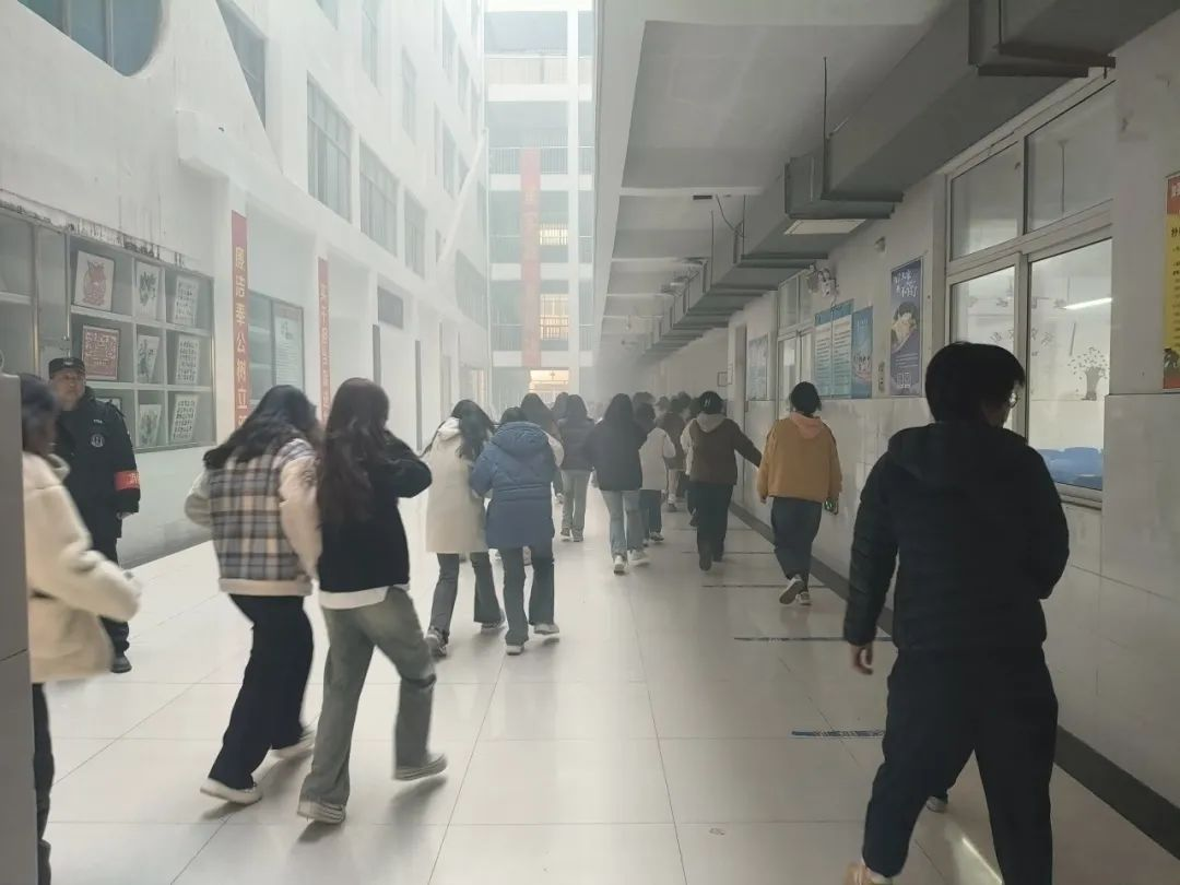 下午5:00,3号教学楼内突然响起警报声,辅导员第一时间指挥和组织班级学生应急疏散,带领学生用手帕、毛巾等捂住口鼻,弯着腰,沿着指定路线,快速、有序撤离到实训广场,之后清点人数,确保无一人遗漏。各楼层疏散点领导和教师全程参与,保证学生疏散过程的安全,避免出现拥挤和踩踏现象。