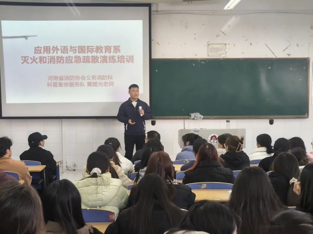 此次培训邀请河南省消防协会义务消防科科普宣传服务队黄耀光老师于下午4:30在3301教室宣讲消防安全疏散演练相关知识,普及了消防标志以及如何逃生、报警等消防安全知识,引导学生学习、掌握发生火灾时紧急应对的方法。