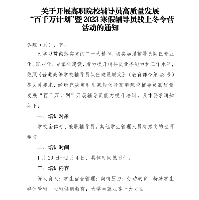 关于开展高职院校辅导员高质量发展“百千万计划”暨 2023 寒假辅导员线上冬令营