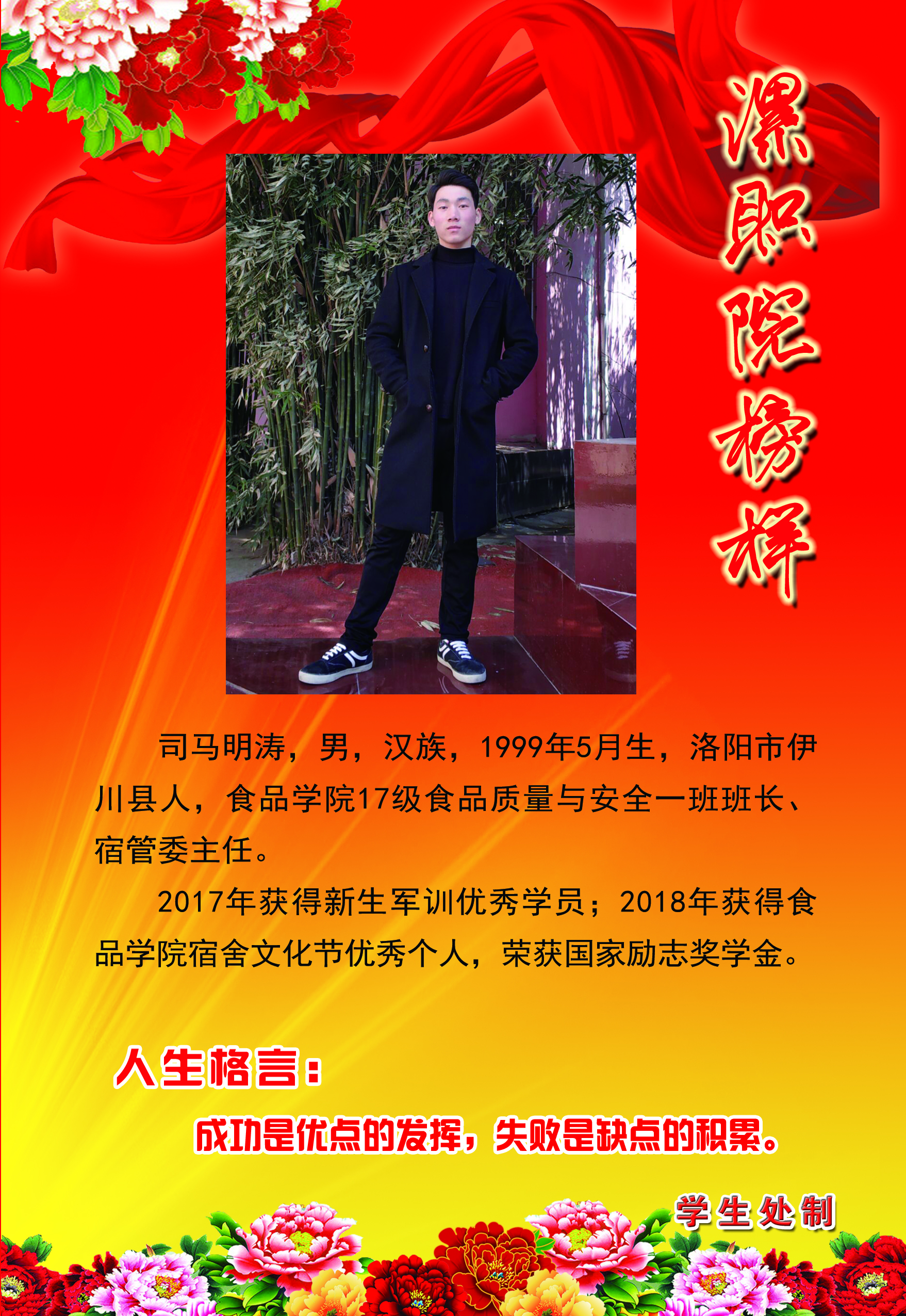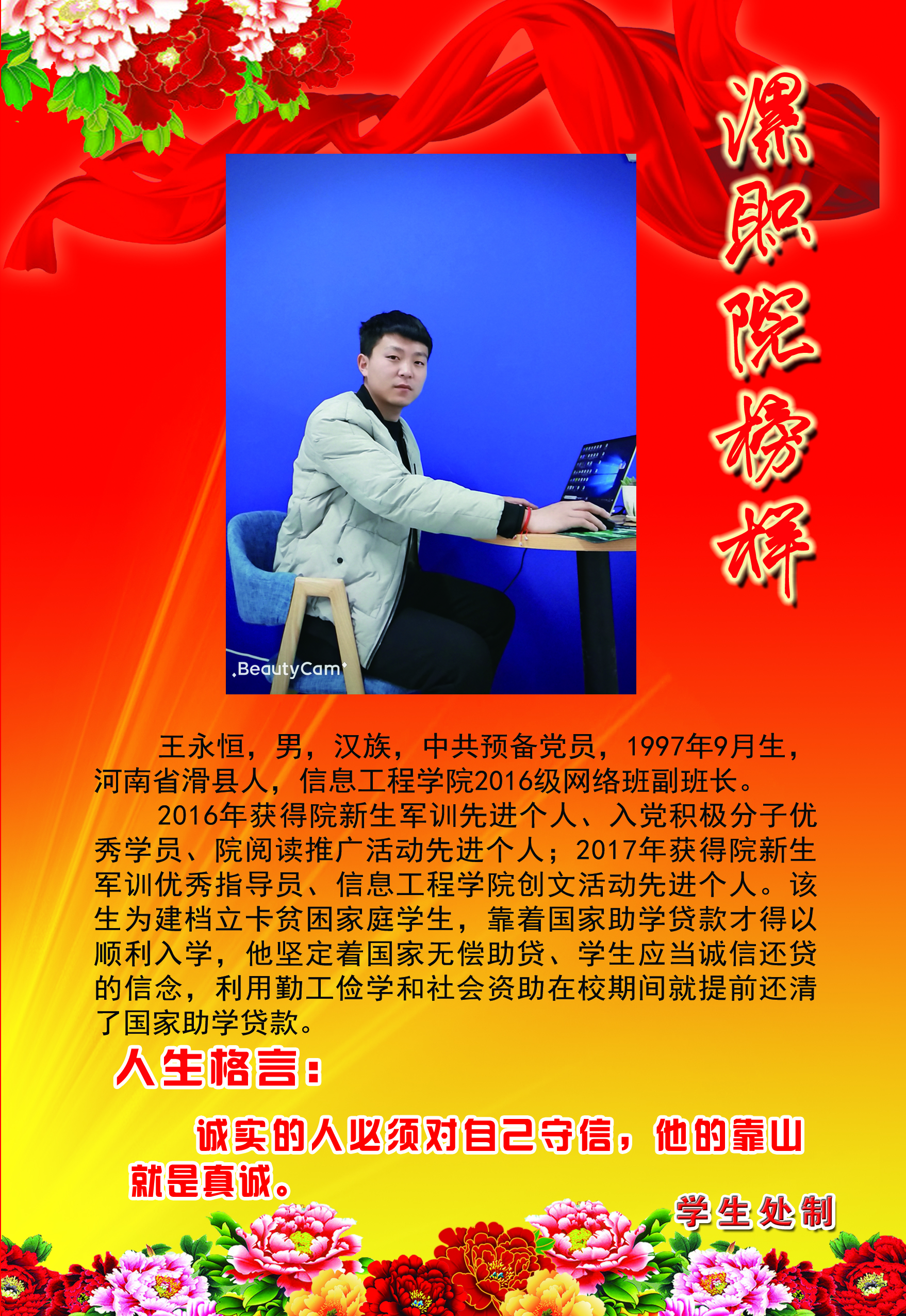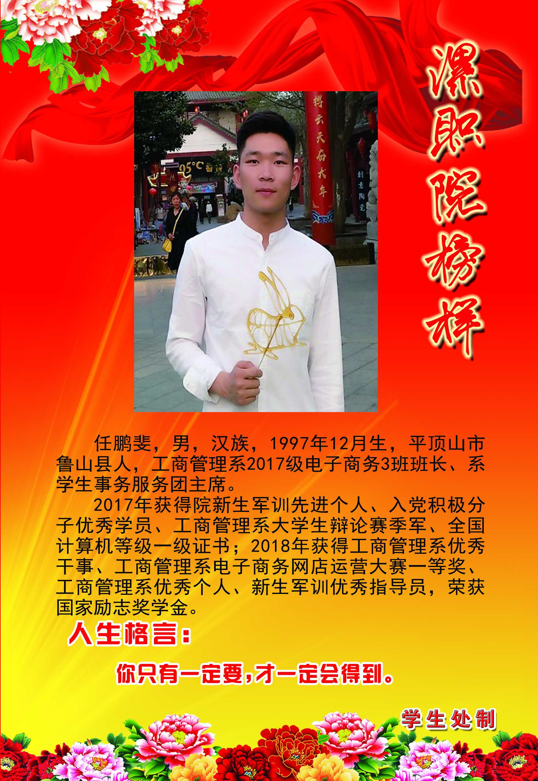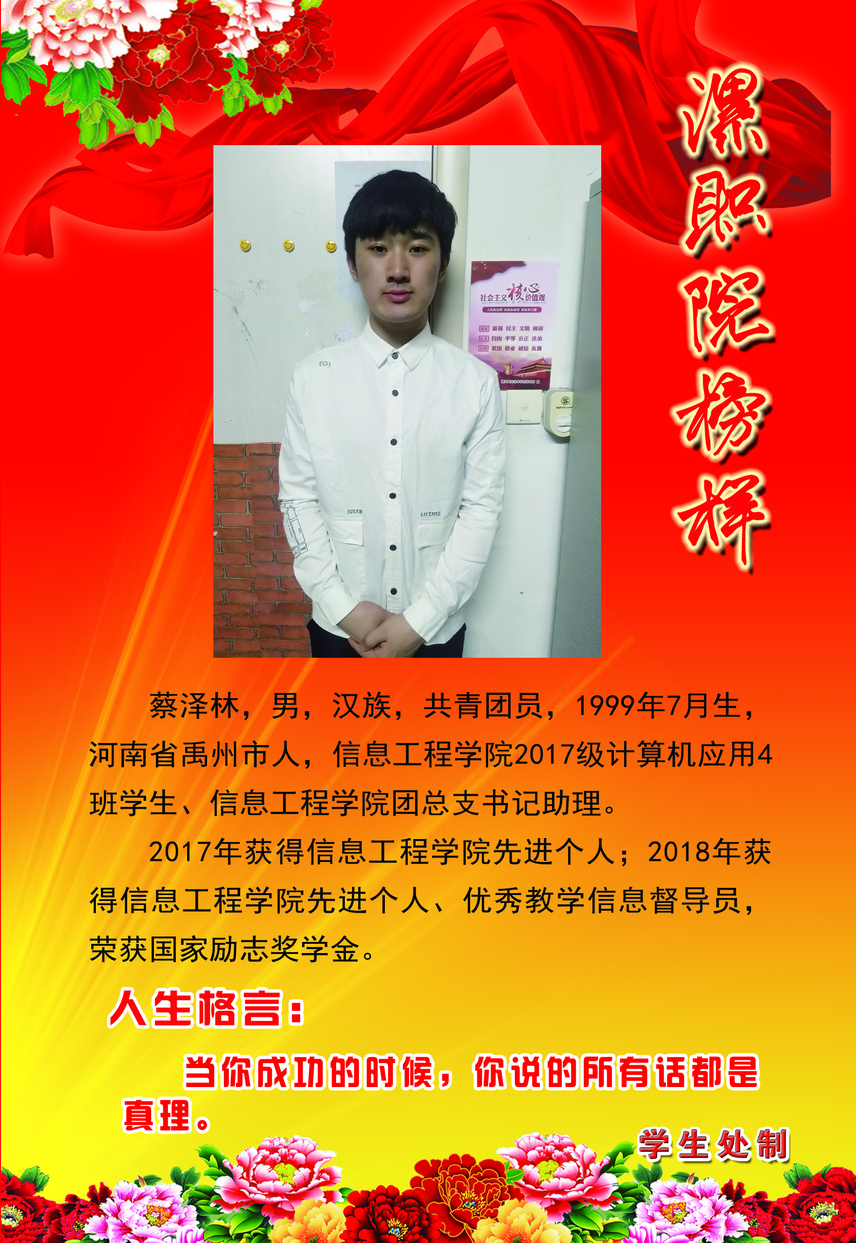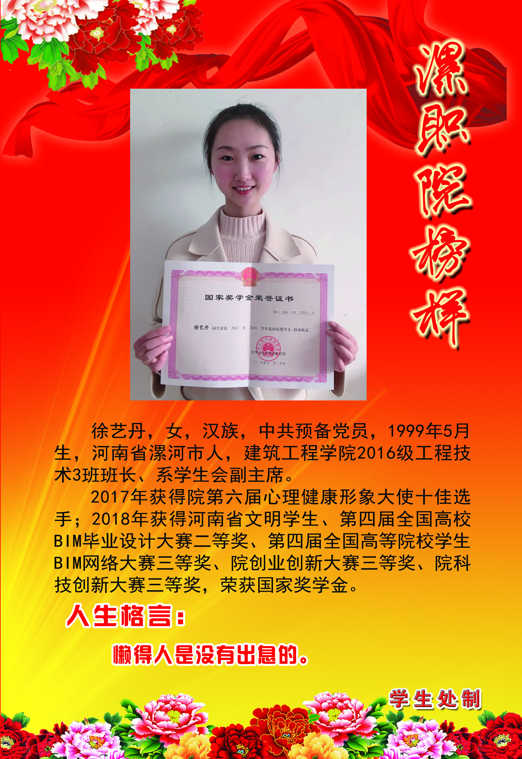 为了充分展现我院大学生积极进取、奋发有为的精神风貌,发挥榜样的示范、引领、激励作用,经过各系部评选、推荐和学生工作部(处)审核,全院共评选出26名“漯职院榜样”。这些榜样都是从我院国家奖学金、励志奖学金获得者和品学兼优的励志自强的学生中产生。本着树立典型、学习优秀的原则,学生工作部(处)对“漯职院榜样”统一进行风采展示。