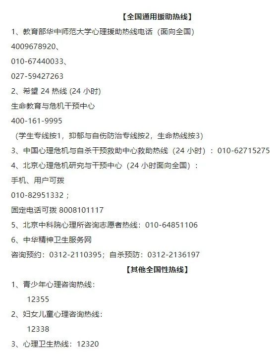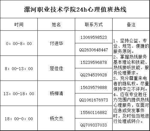为做好我校学生的心理防护工作,引导大家以积极、健康的心态度过假期,我校心理疏导热线已经开通,多位专业心理咨询老师24小时轮流值班,不间断地为全校学生及学生家长提供心理咨询和疏导服务。