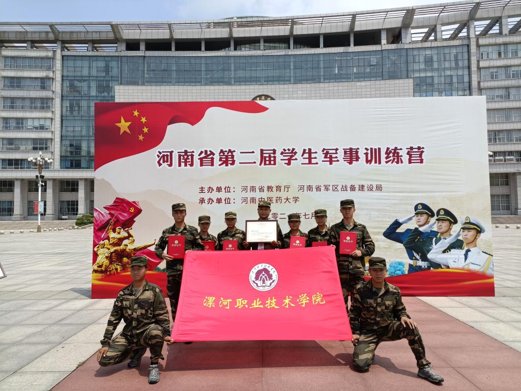 近日,由河南省教育厅、河南省军区战备建设局主办,河南中医药大学承办的河南省第二届学生军事训练营成功举办。漯河职院荣获军事技能训练集体二等奖、军体拳第一名、班队列第三名的优异成绩,董洪涛老师获得优秀领队荣誉称号,张垚、张莹莹、朱柳柳等三位同学获得了个人训练标兵荣誉称号。