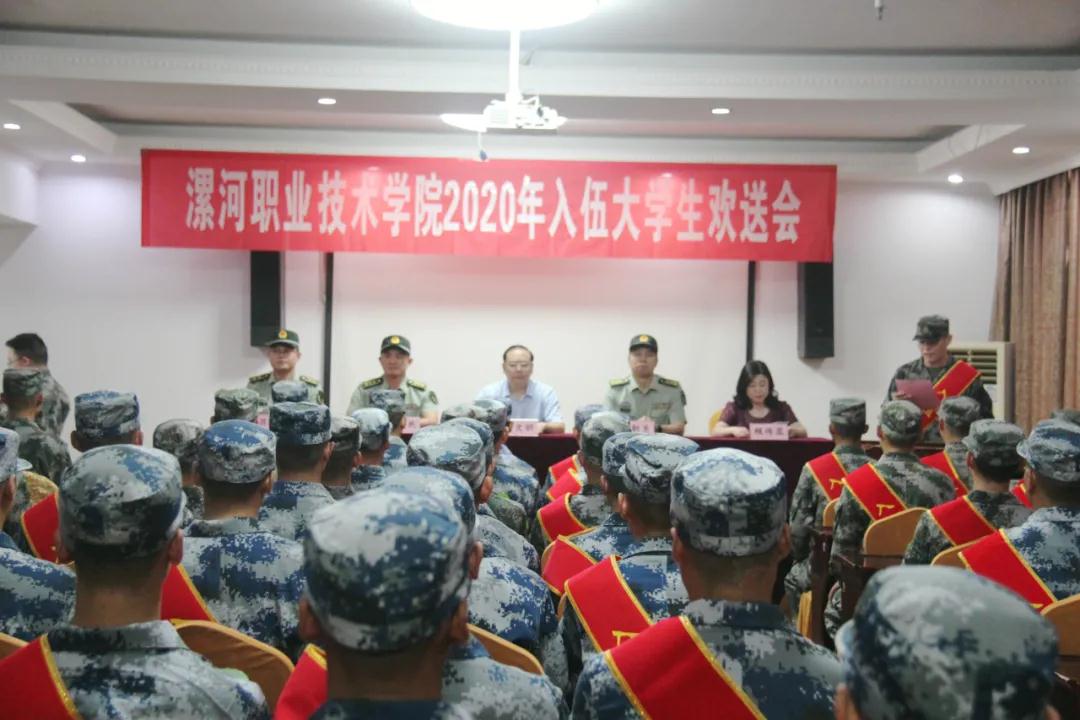 9月9日上午,OK138太阳集团举行了2020年入伍大学生欢送会,热烈欢送今年应征入伍的大学生新兵,校党委书记顾文明出席会议并讲话,副校长程传蕊主持会议,漯河市军分区战备建设处处长陈朝东上校、漯河市军分区动员处处长周建民上校、漯河市源汇区武装部副部长吕晓中校及学校相关部门负责同志、学校入伍的89名大学生士兵出席了欢送会。